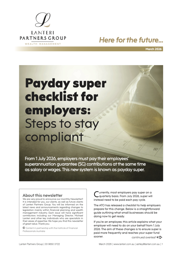 Welcome to the March edition of our client newsletter. This month, we’ve brought together a range of timely and practical insights across tax, superannuation and financial planning, all designed to help you stay informed, prepared and in control of your financial position.
